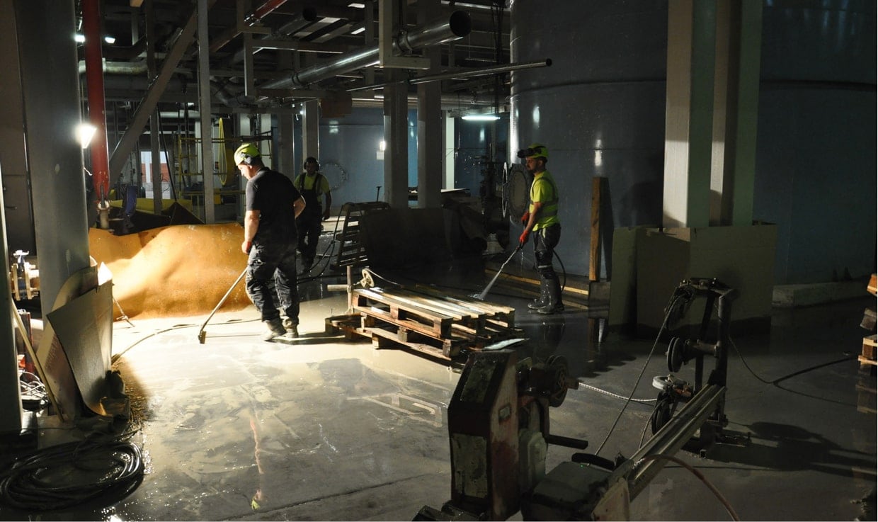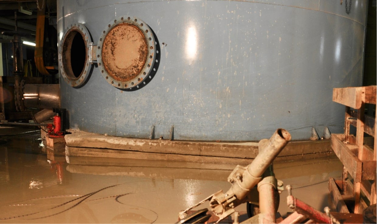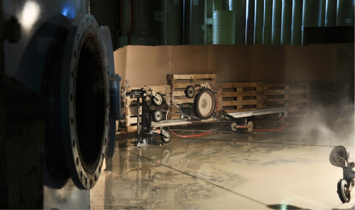 Шлам и воду, образовавшиеся в большом количестве в процессе канатной резки бетона на всём протяжении работ, убирали промышленными пылесосами.